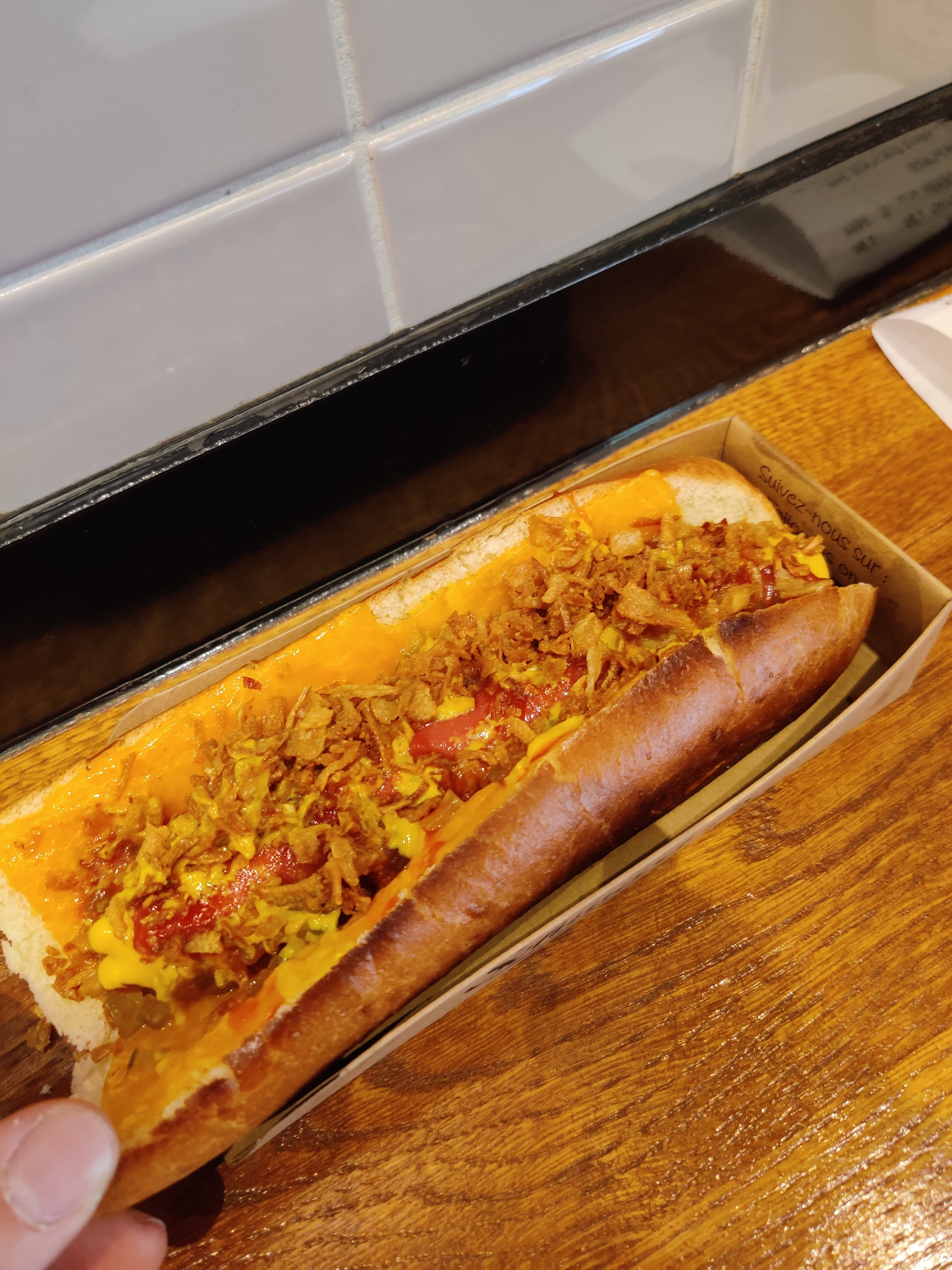 Une grosse déception. Nous sommes deux et posons des questions concernant le menu. Le monsieur nous regarde avec des yeux de merlans frits. Parle dans sa moustache et forcément, nous ne comprenons rien. Son collègue prend la relève et c'est la que nous percutons que la première personne à qui nous nous sommes adressés ne comprend pas le français ! Le serveur est très expéditif, le service déplorable même pas de plateaux pour mettre 2 hot-dogs 2 portions de nachos et les 2 boissons, obligés de tout prendre à la main. Tout ça pour avoir 0 plonge à la fin du service. Aucune possibilité d'avoir un gobelet. Et le comble : pas de toilettes. Alors là c'est le pompon. Bref 2 étoiles car l'endroit laisse à croire que c'est assez propre et que le hot-dog était sans plus, bon mais pas transcendant. En plus c'est relativement cher ! Environ 10€ pour le menu avec hot-dog de base avec des nachos qui sont blindés de cheddar et de guacamole avec boisson !! Je ne recommande pas.