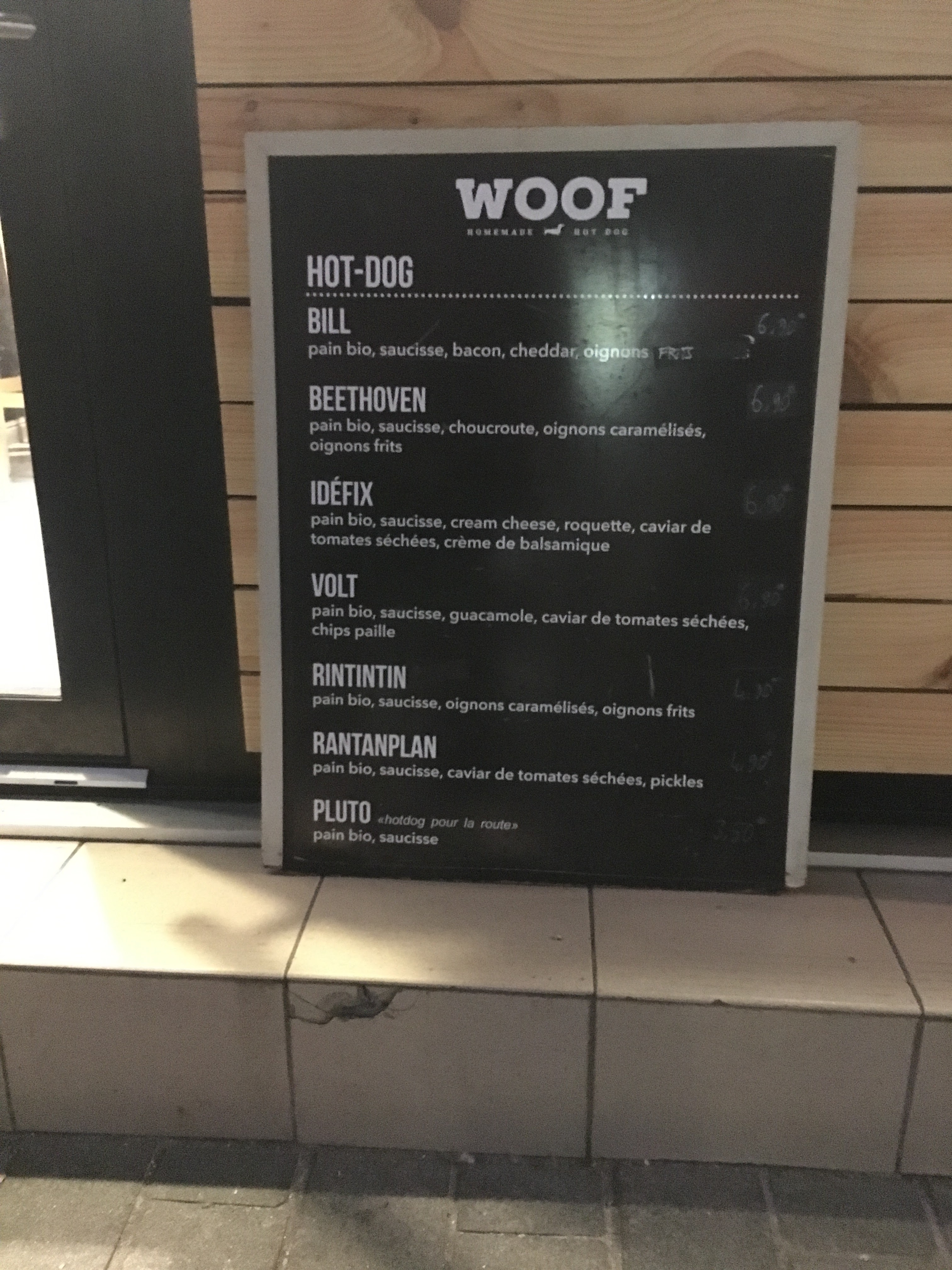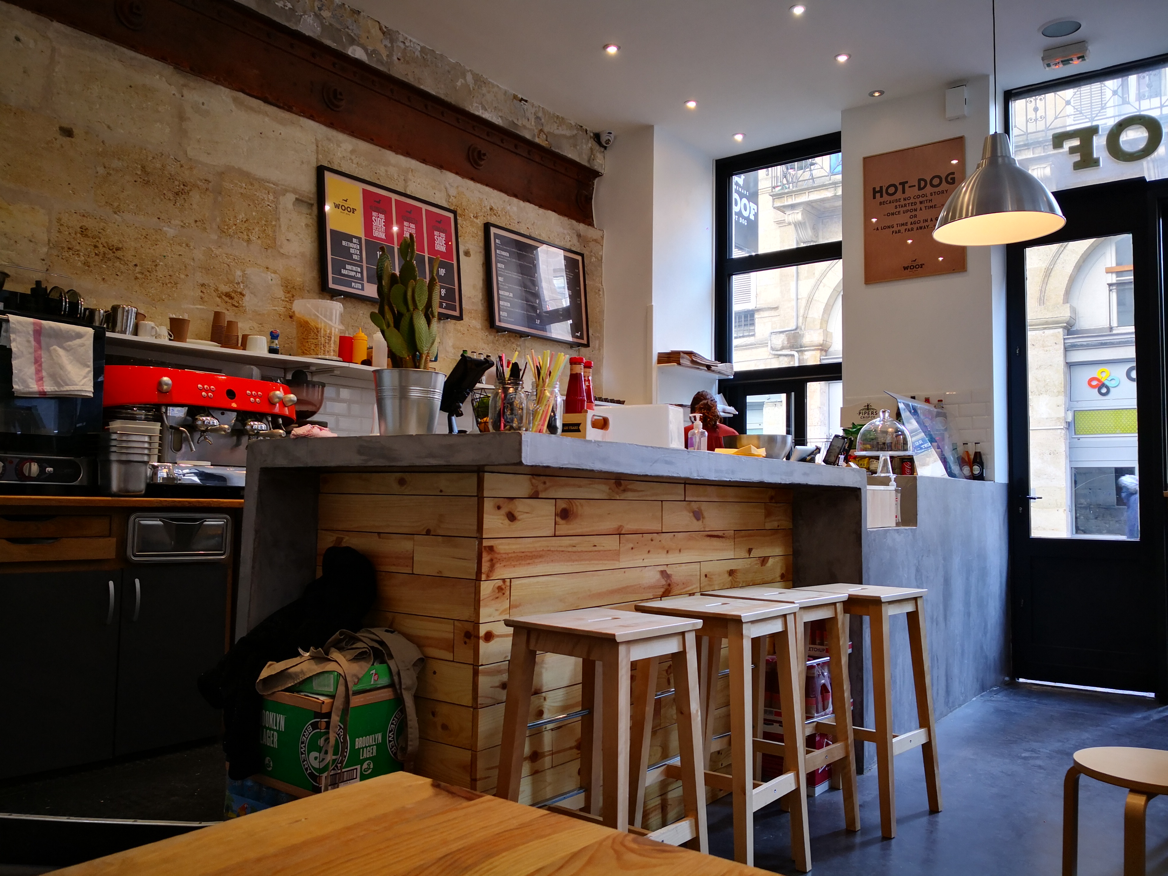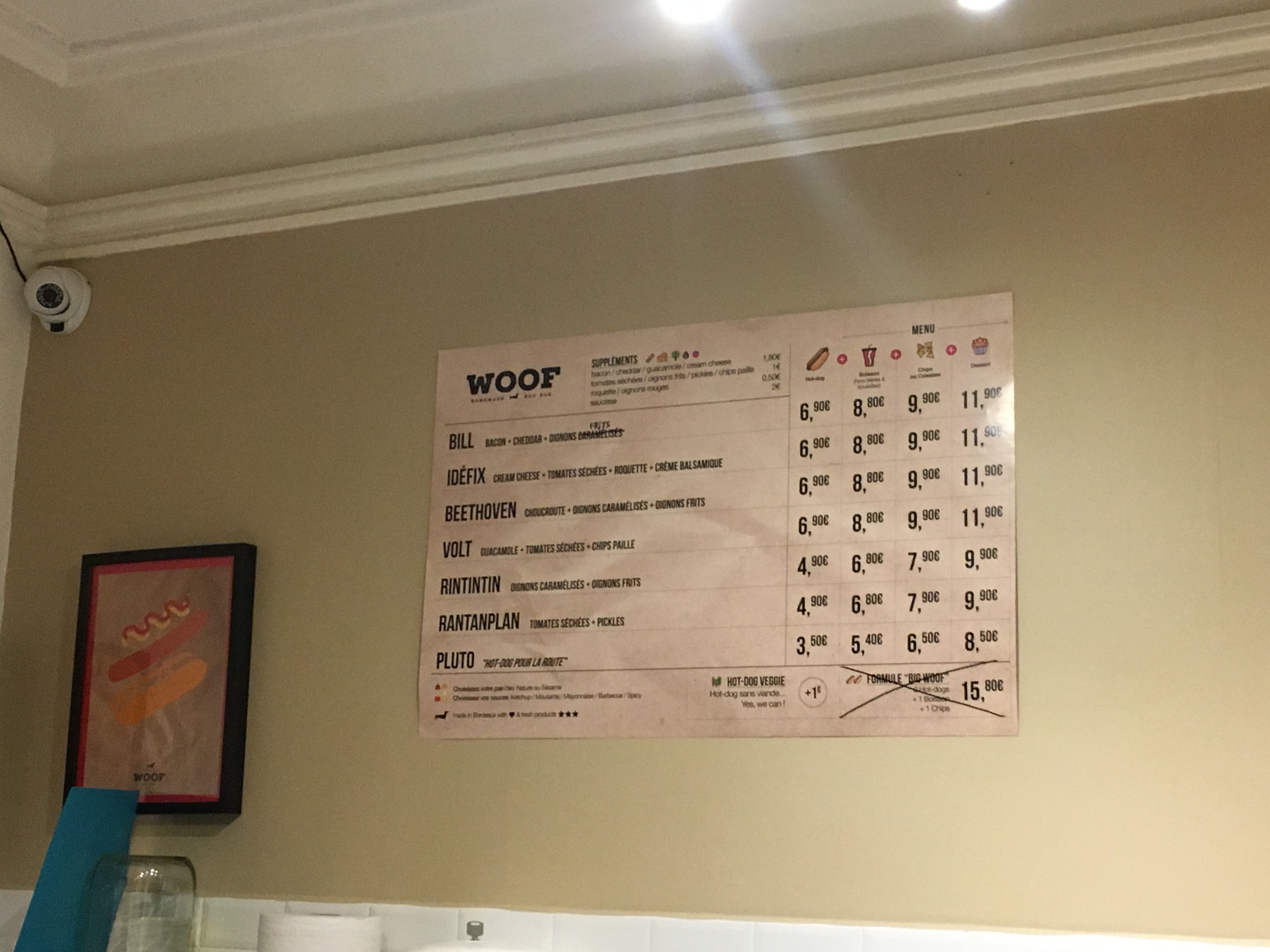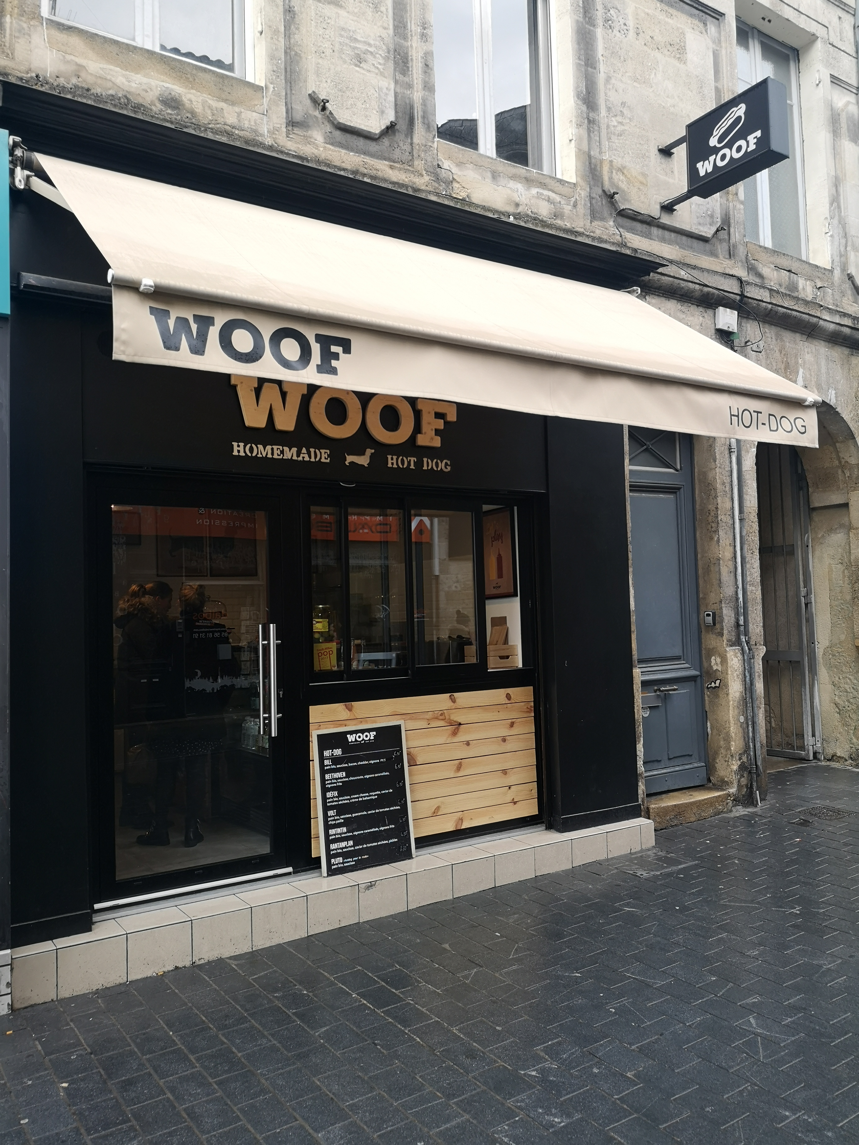 J'ai visité Woof à Bordeaux la semaine dernière. Des hot-dogs incroyables, nos deux enfants ont dit qu'ils étaient les meilleurs hot-dogs de l'univers, ma femme avait un bagel et elle a dit que c'était à tomber par terre et aurait souhaité en commander deux. Un excellent rapport qualité-prix ainsi qu'un service très sympathique malgré notre français très limité. Woof s'il vous plaît mettez votre menu de bagels sur votre site Web ma femme veut les faire à la maison.